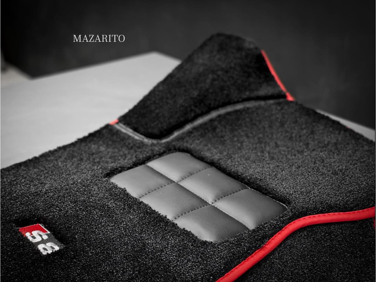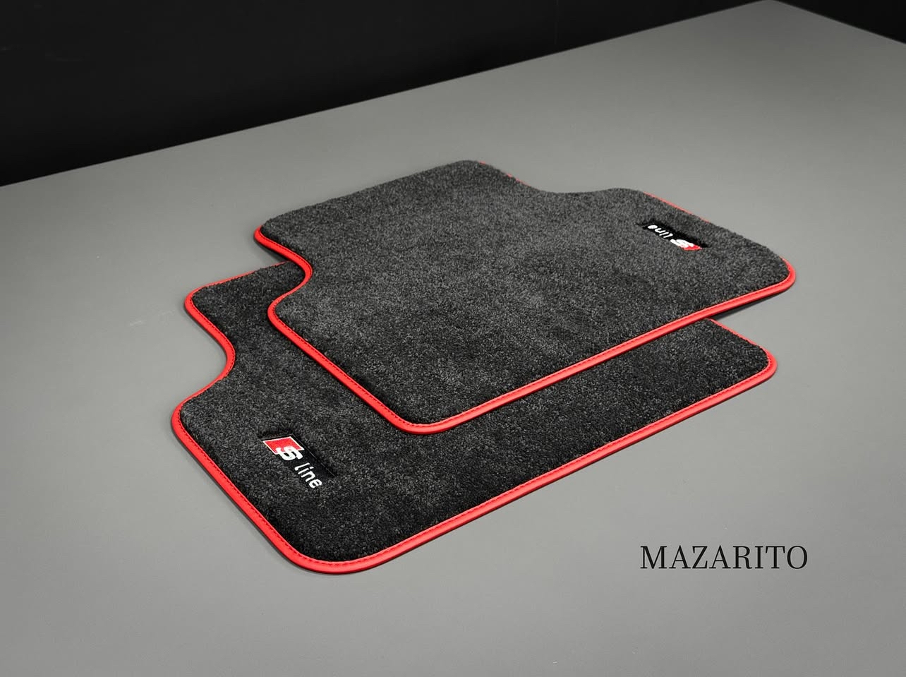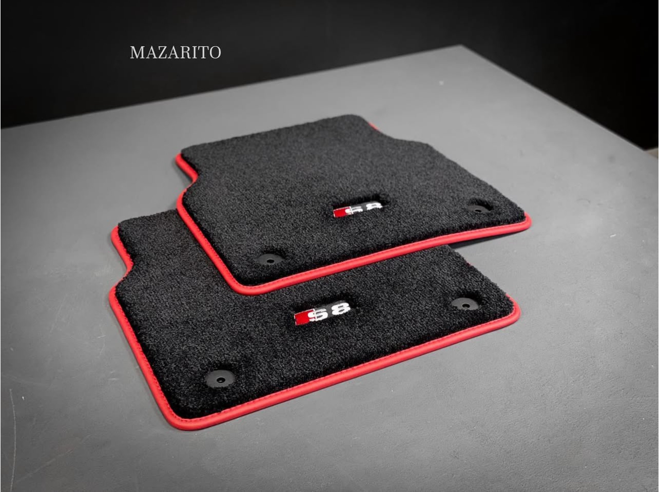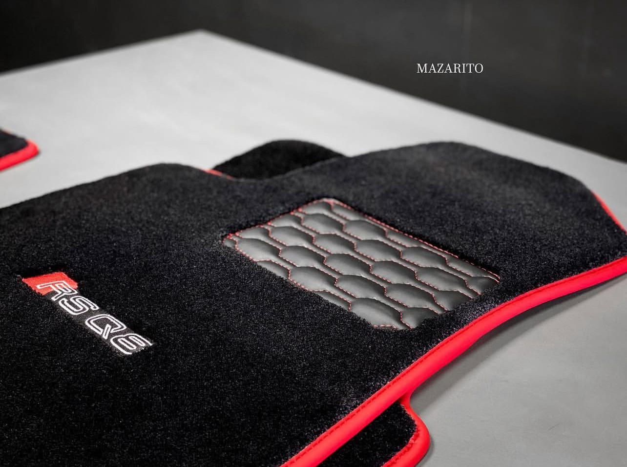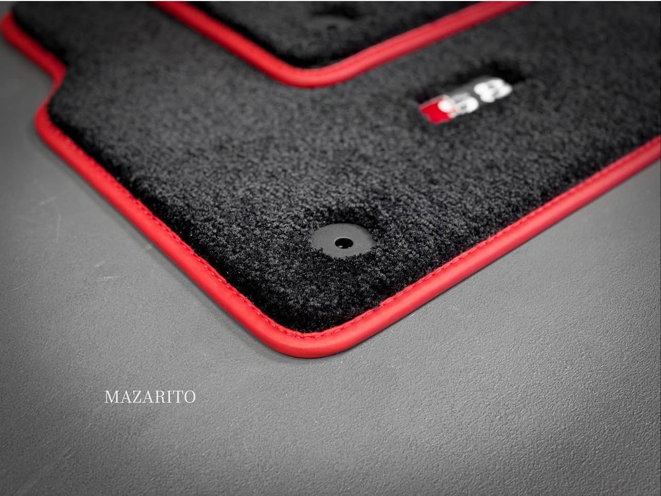 Добавили окантовку из экокожи Наппа красного цвета и вышивки S8 на каждом коврике.