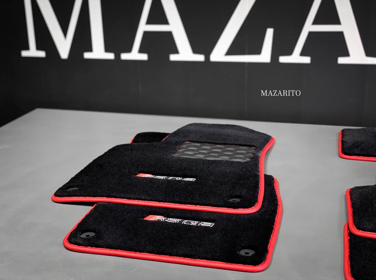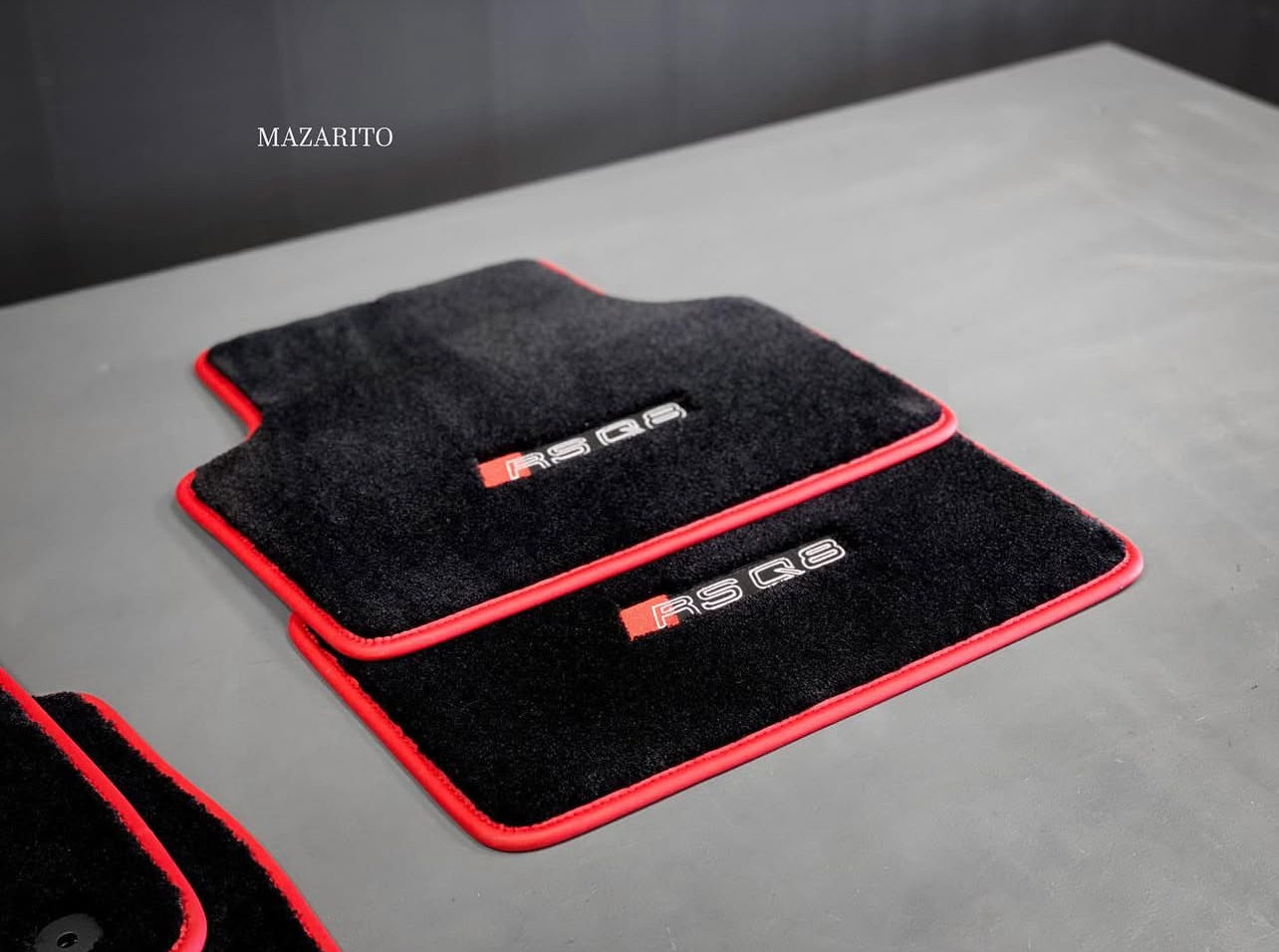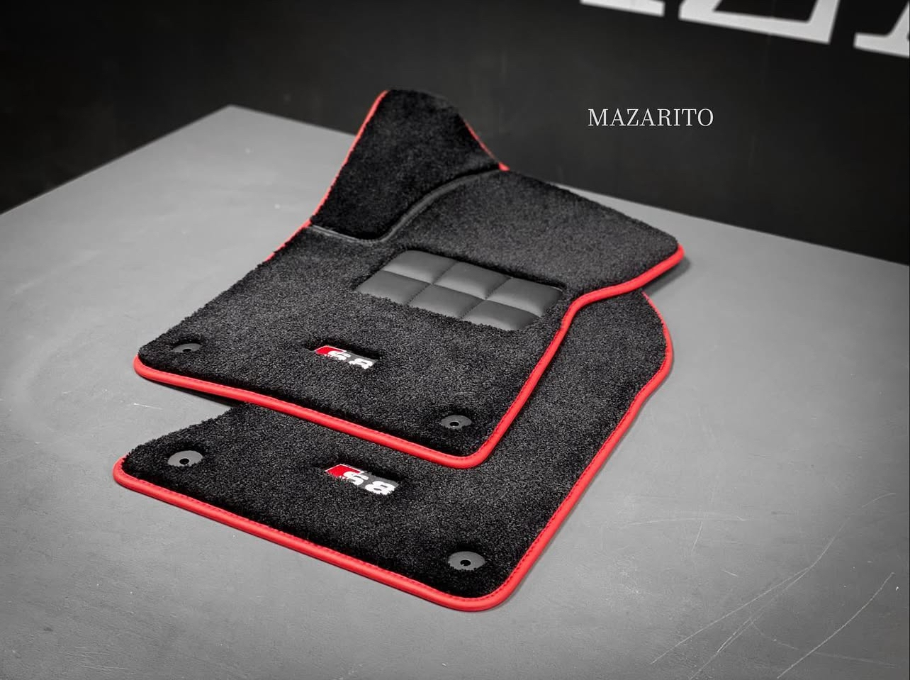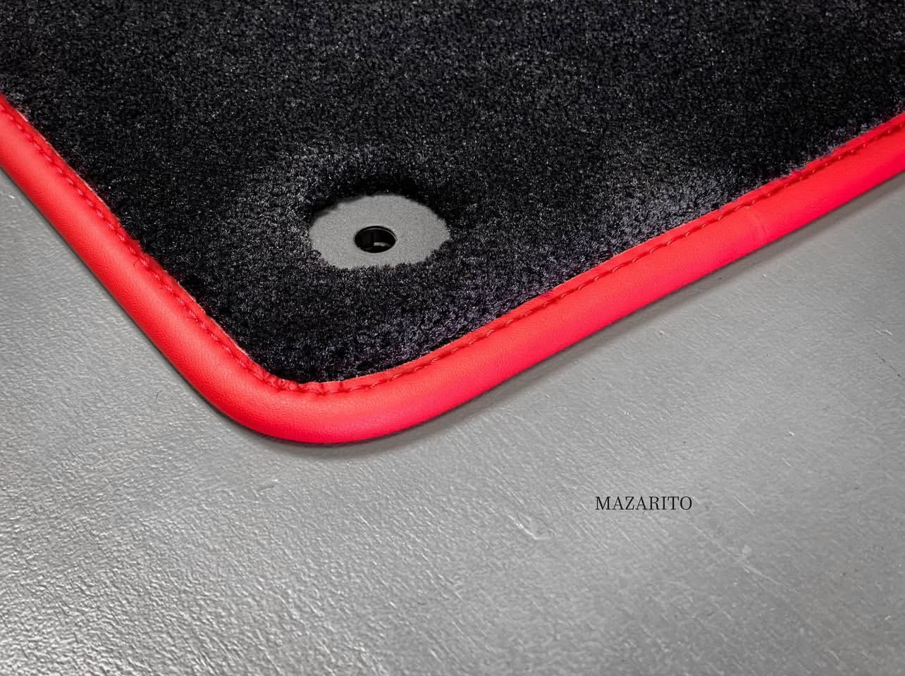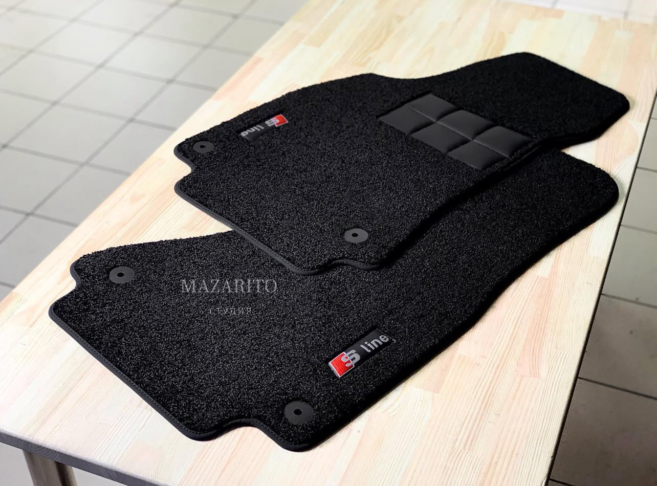 Добавили окантовку из экокожи Наппа красного цвета и вышивки S8 на каждом коврике.