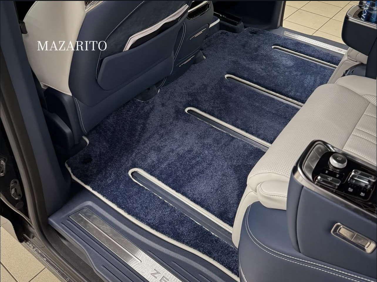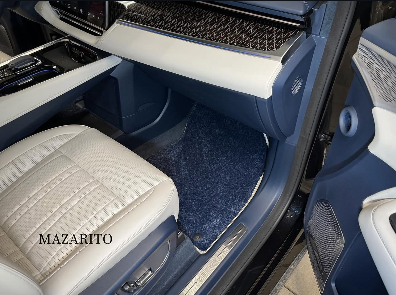 Роскошный люксовый ворс 20mm синего цвета в цвет салона, окантовка в цвет светлых сидений и торпеды.
