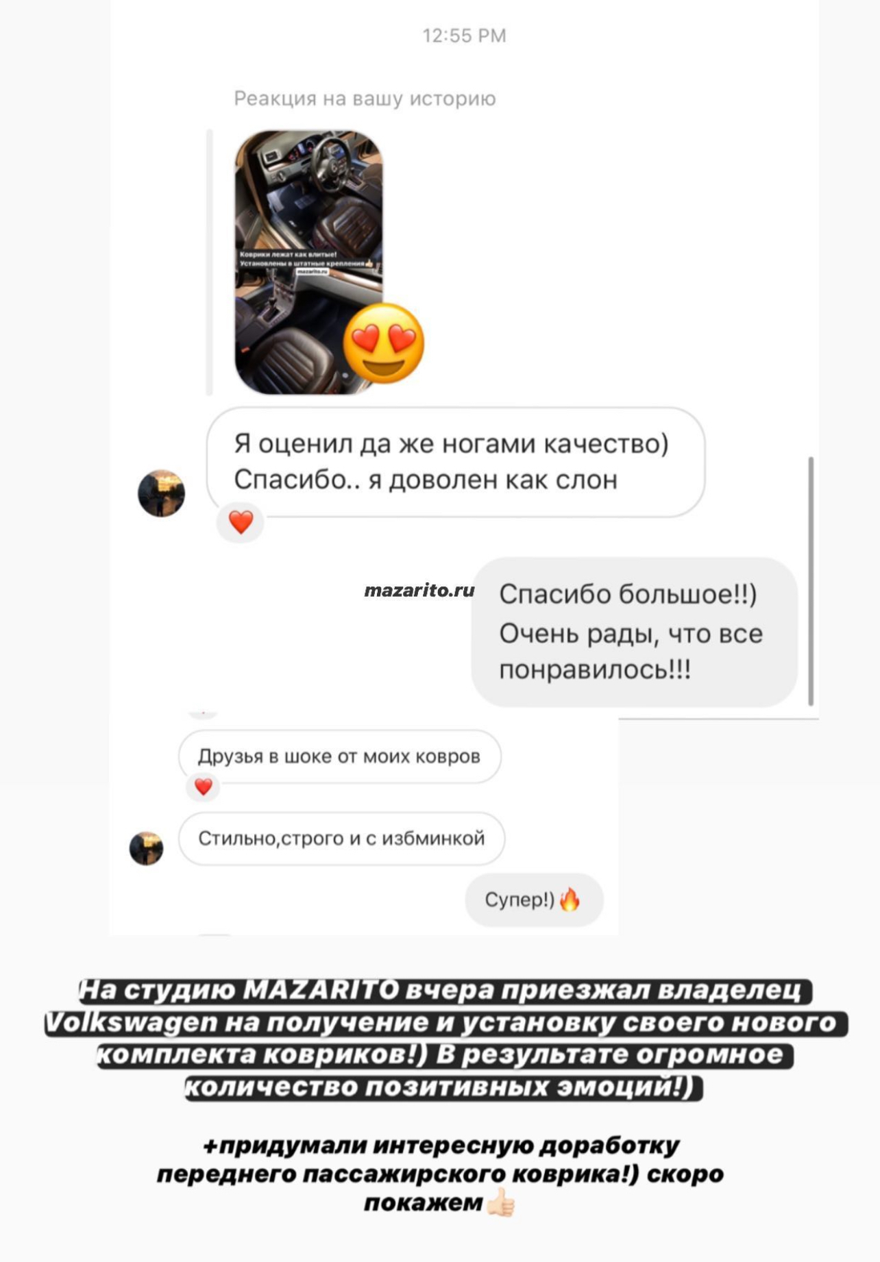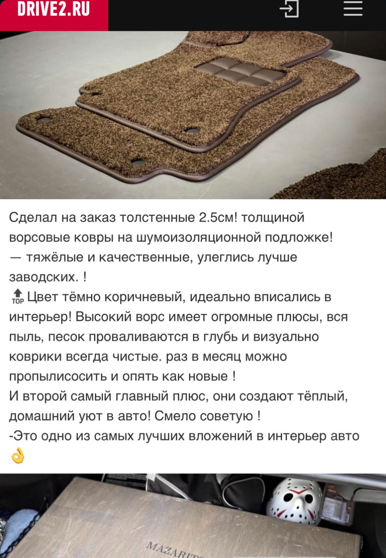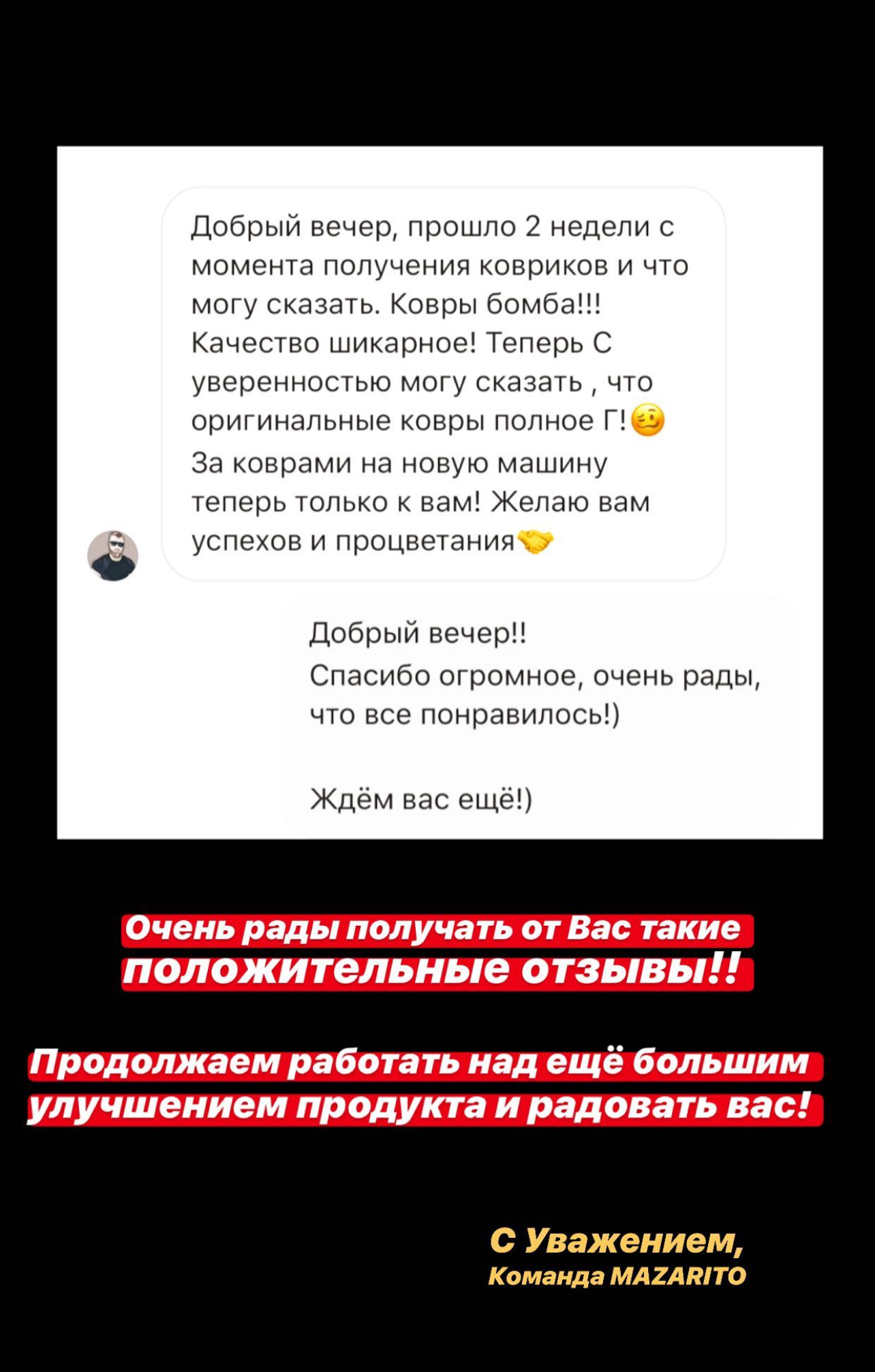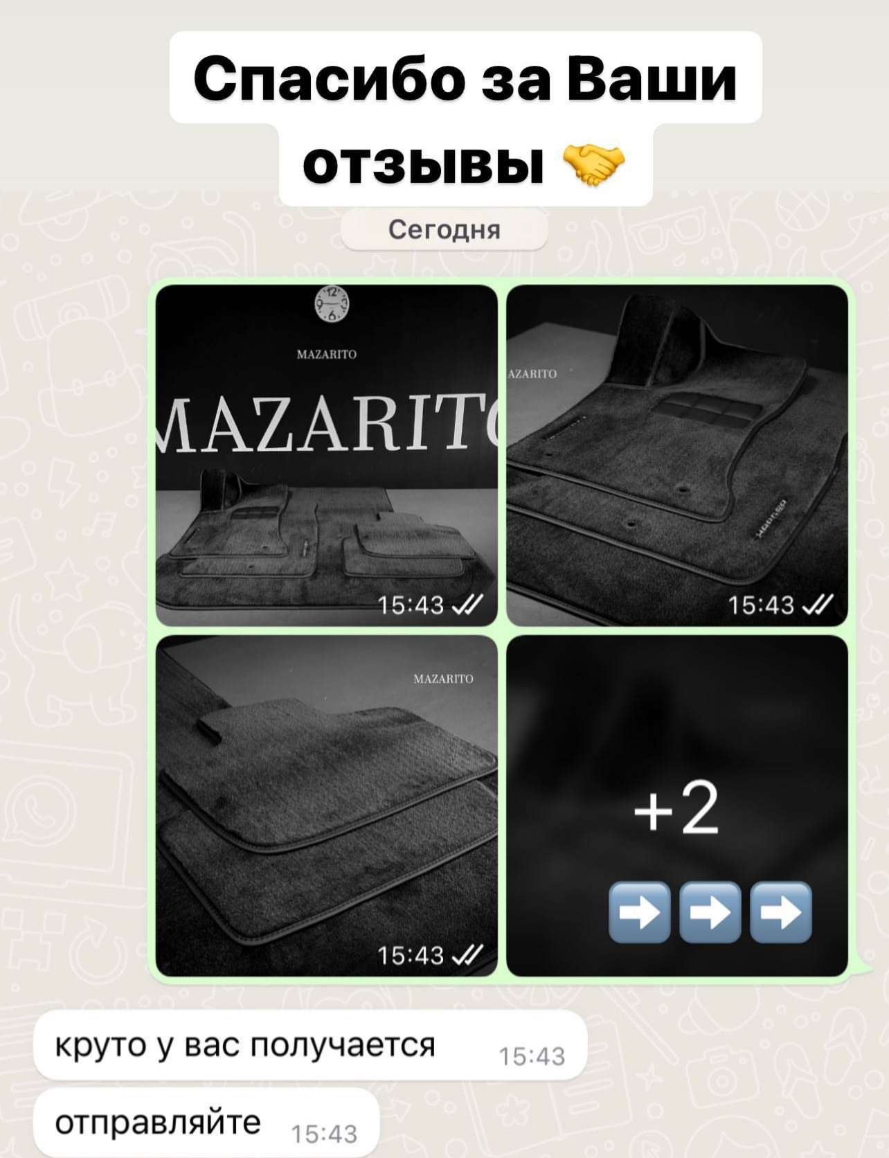 О компании С 2014 года в стенах студии MAZARITO мы изготавливаем автоковрики премиум класса. Производство от 1 дня с доставкой по всей России. Собственное оборудованное ателье. Профессиональные станки в цеху, швейные машинки и мощные сервера для обработки лекал. Доступны опции индивидуального замера Вашего авто и выбор материалов на любой вкус. MAZARITO - Автомобильные ковры как искусство. |