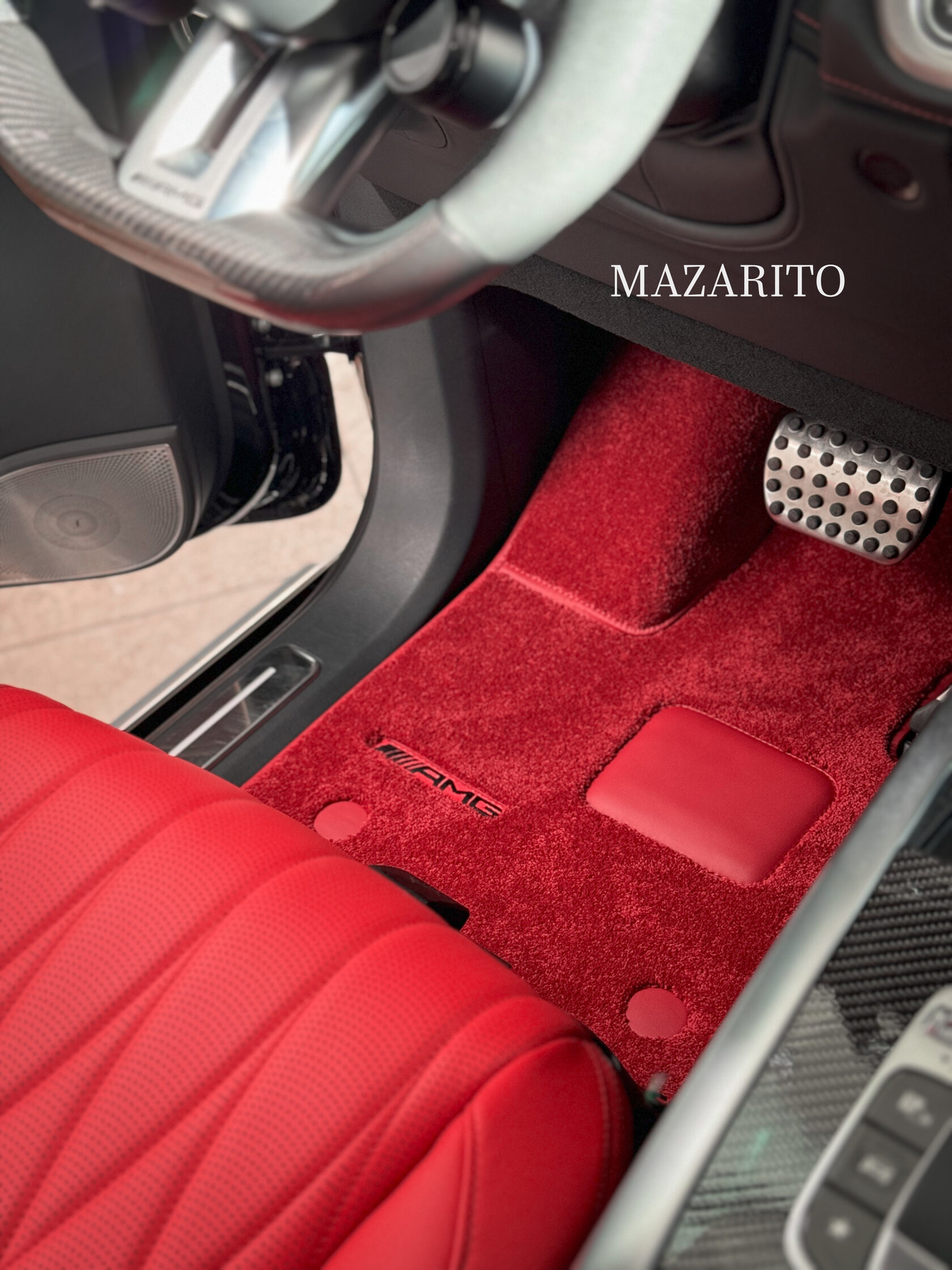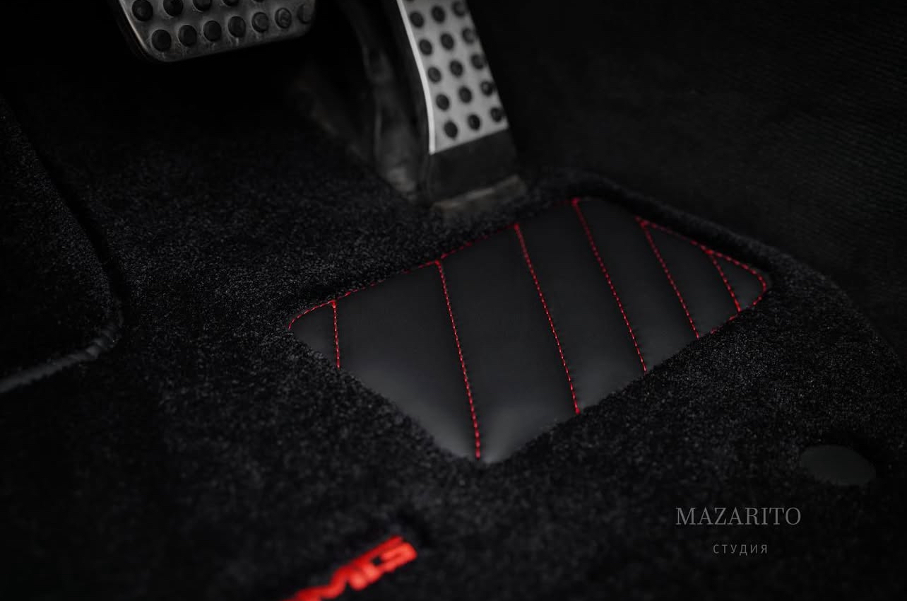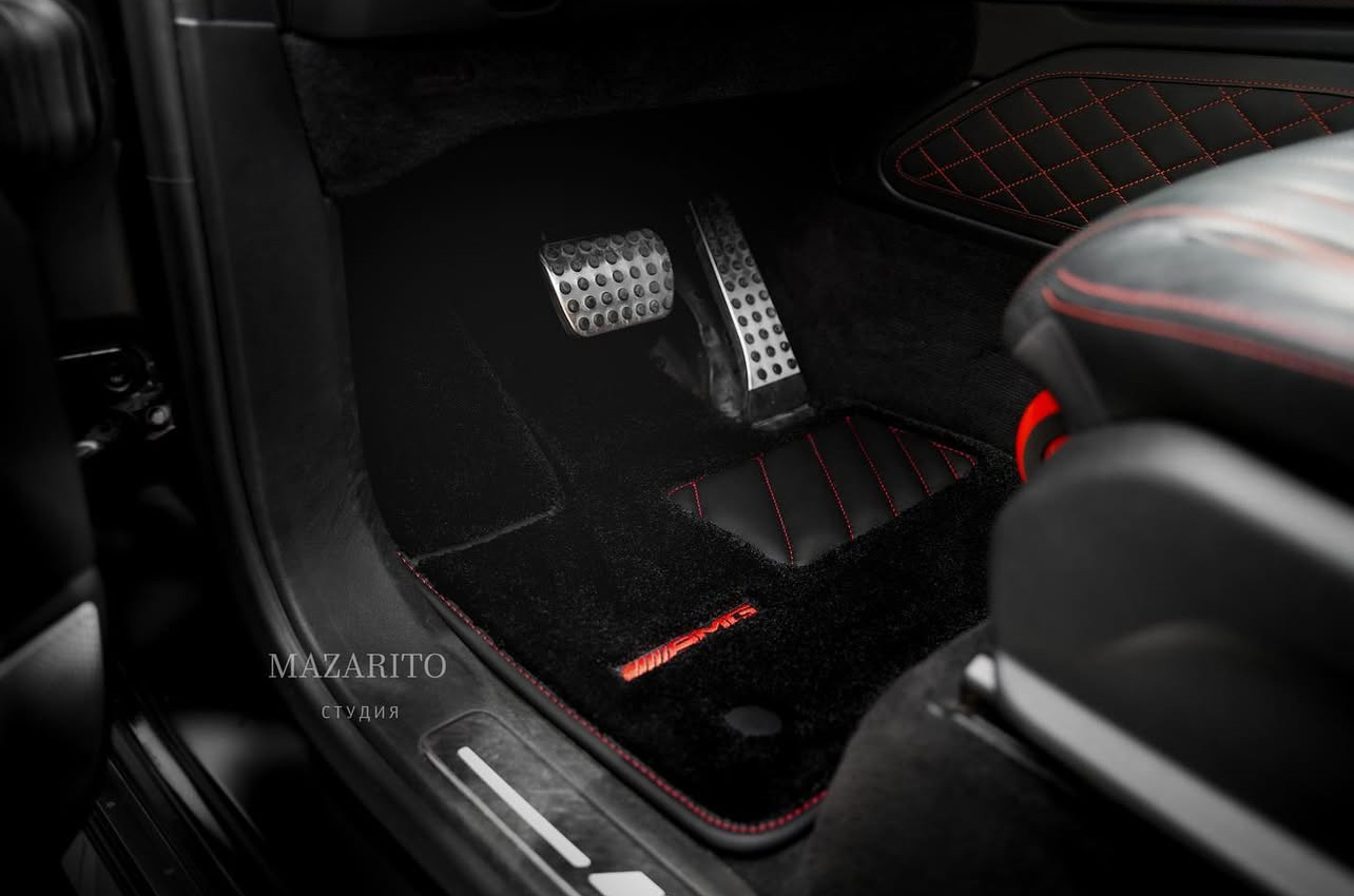 Индивидуальные вышивки логотипов AMG на всех коврах. Водительский ковер с 3D площадкой для левой ноги с кожаным подпятником.