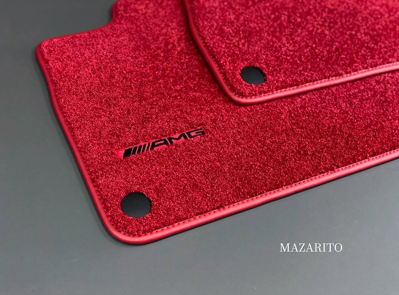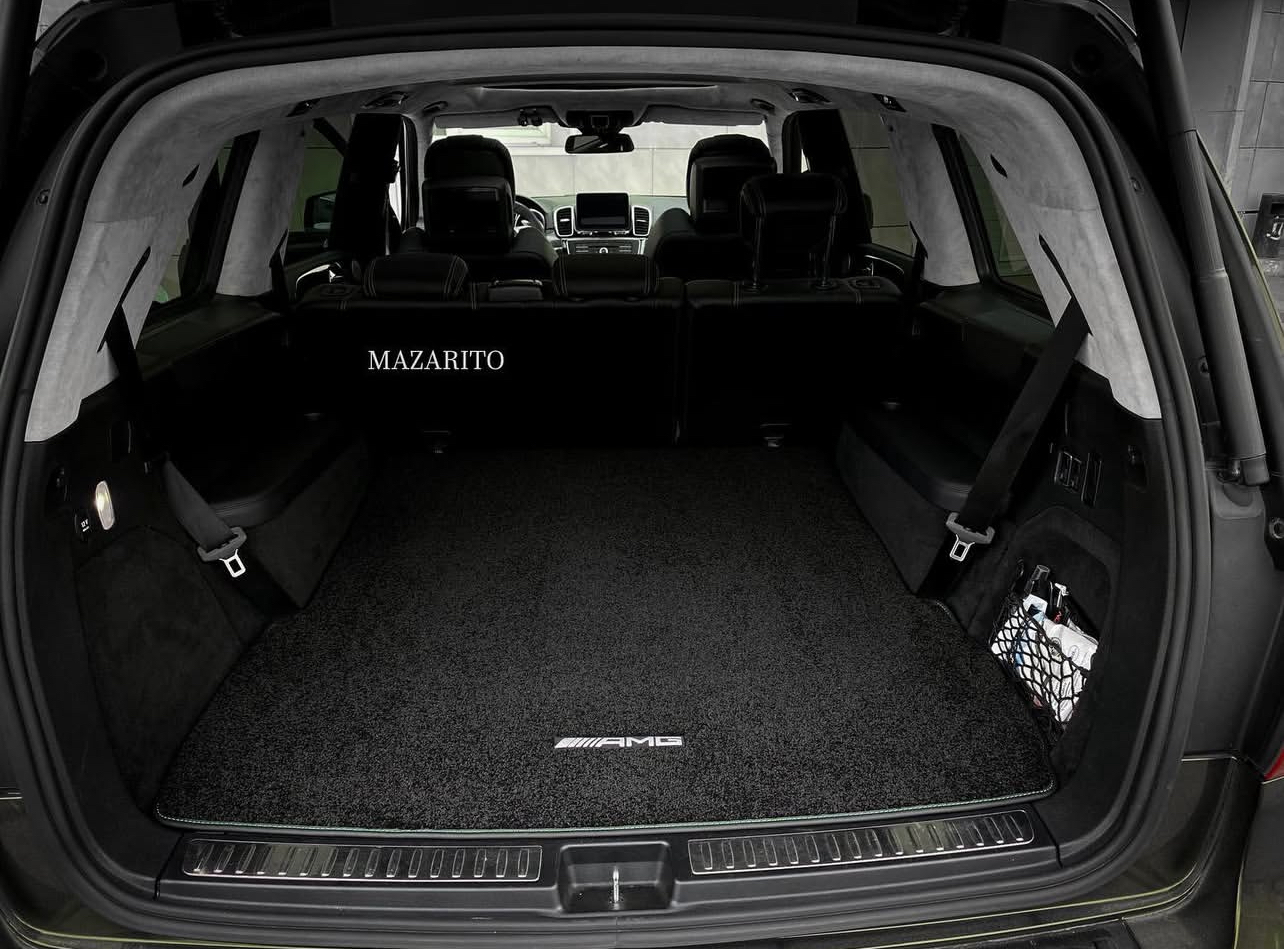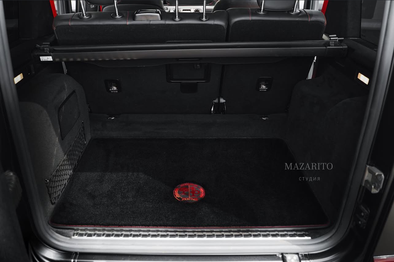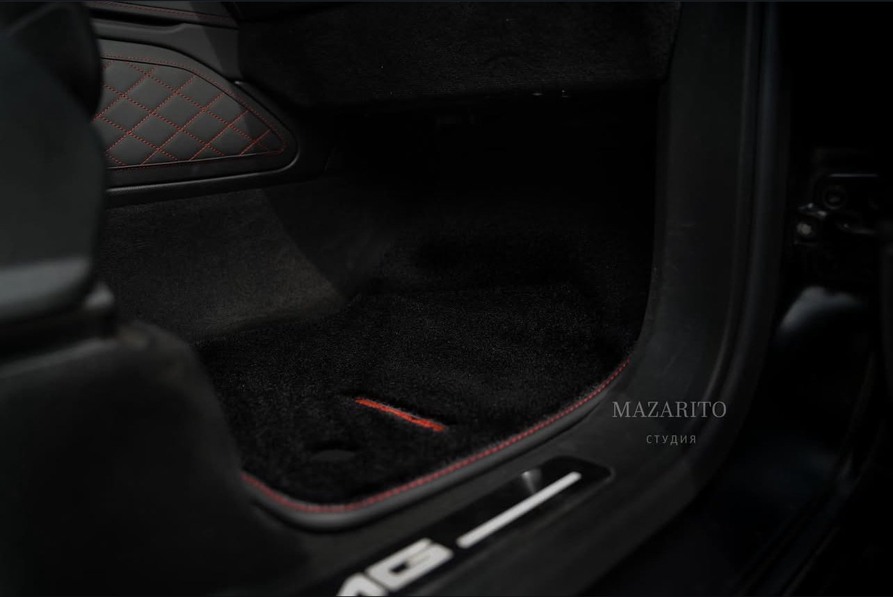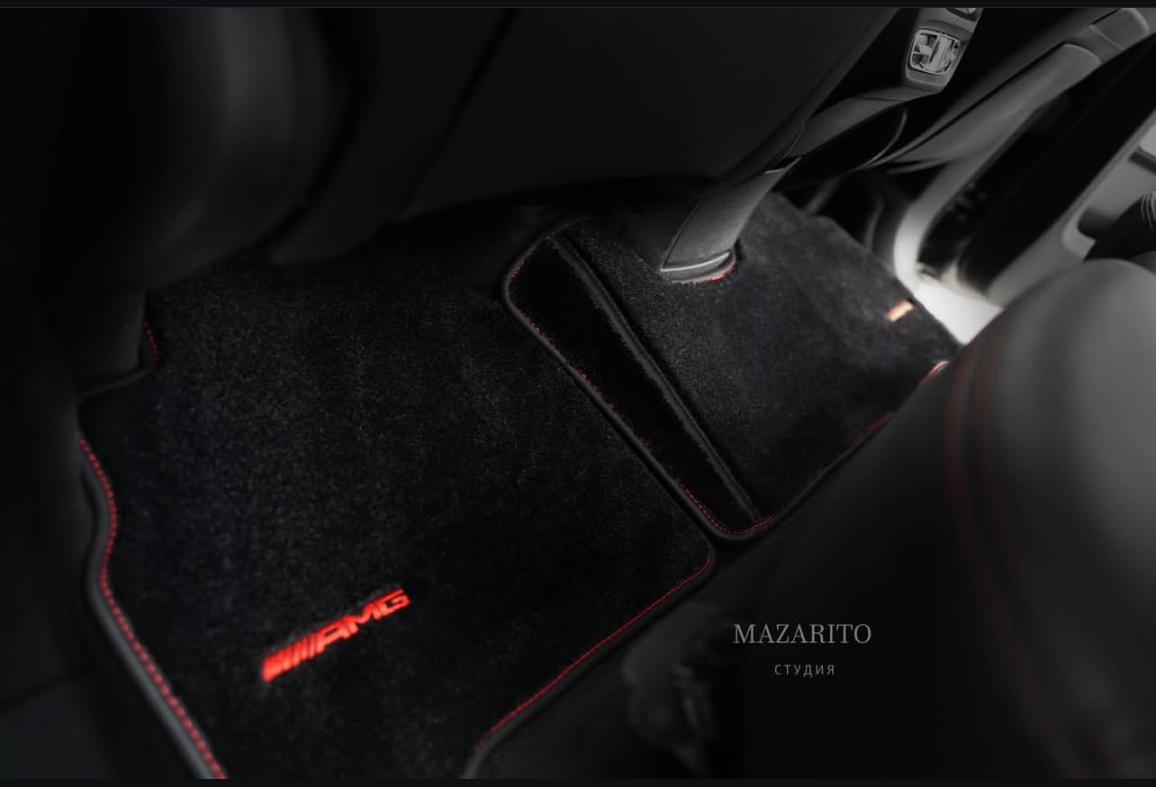 Плотный ворс с крученой нитью на прорезиненной основе. Светлые вышивки AMG в салоне и большая вышивка лейбла AMG в багажном отсеке.