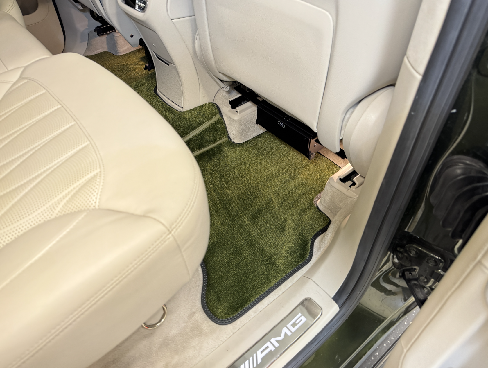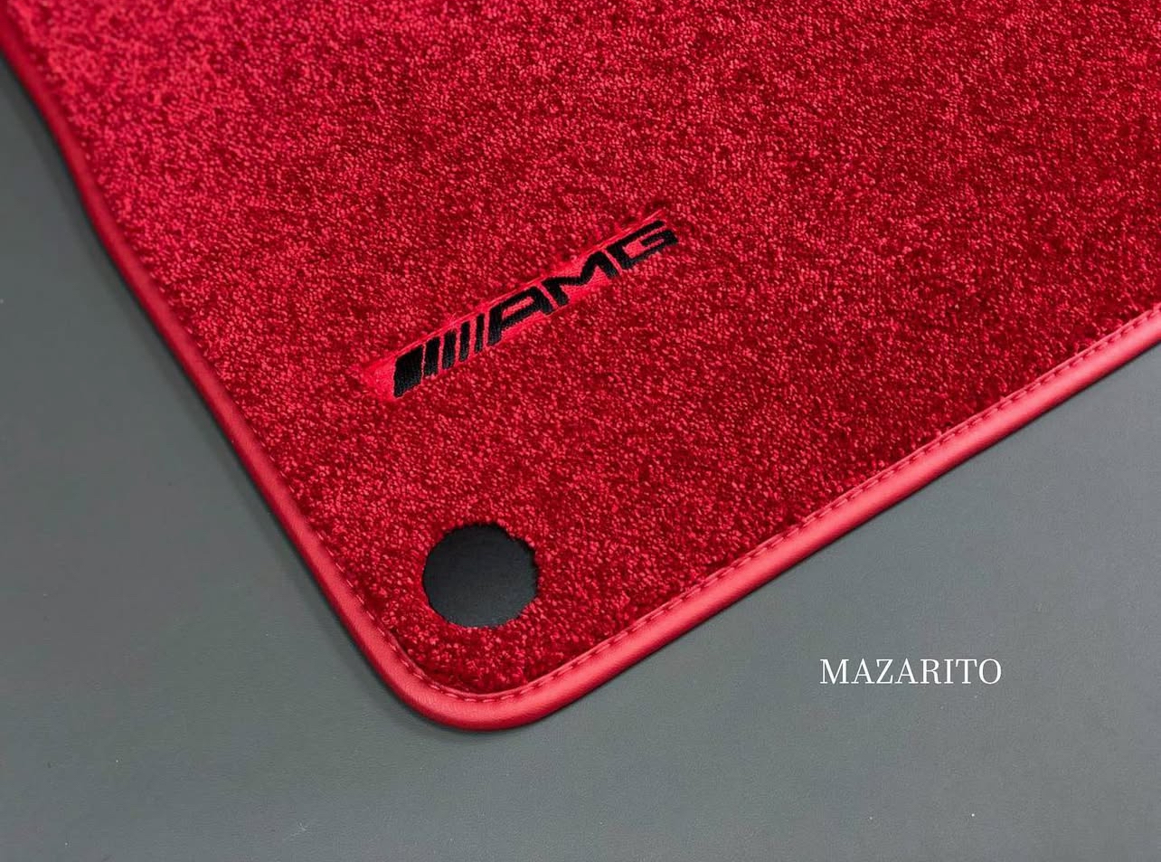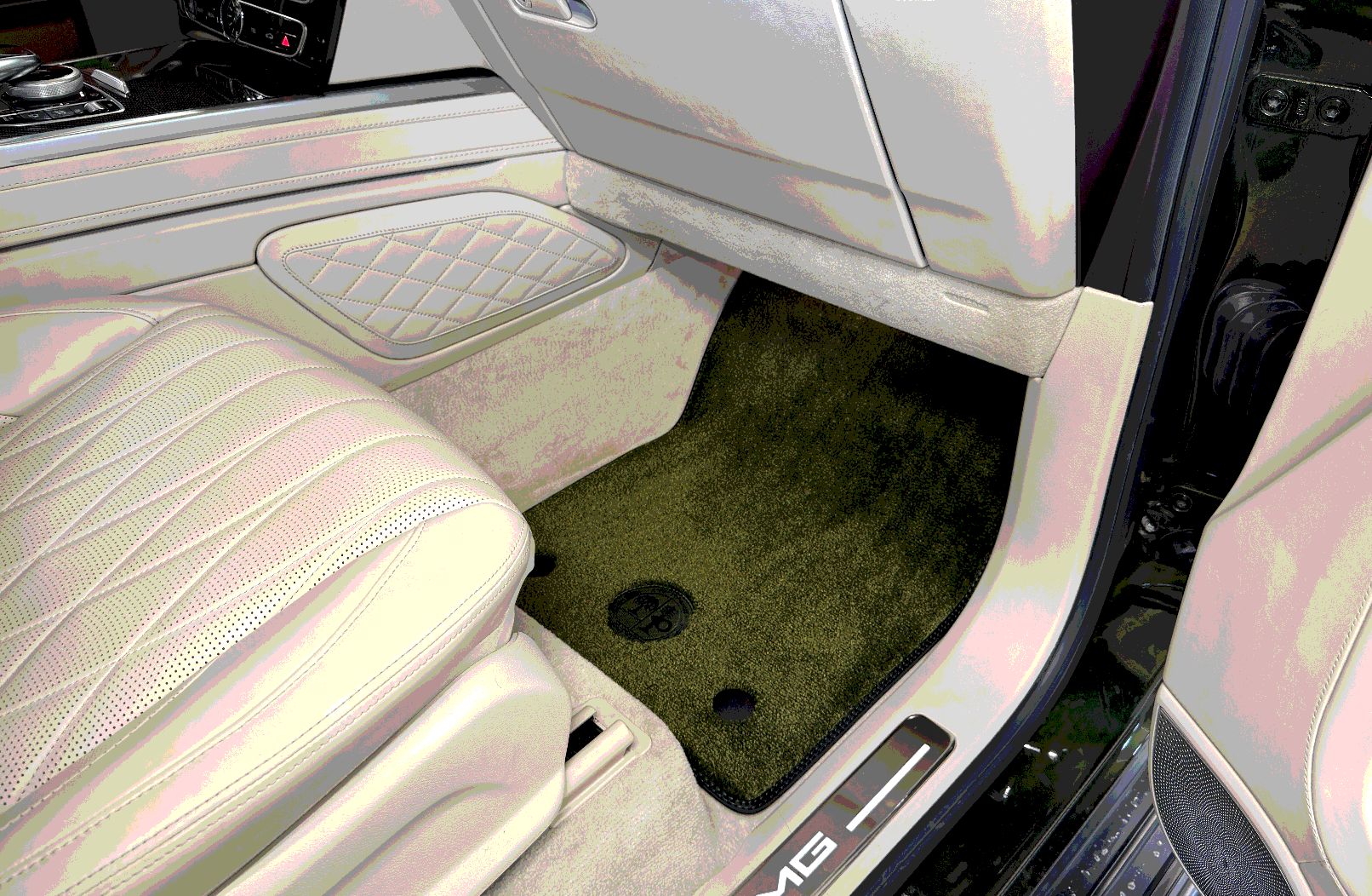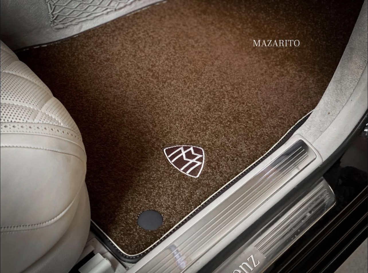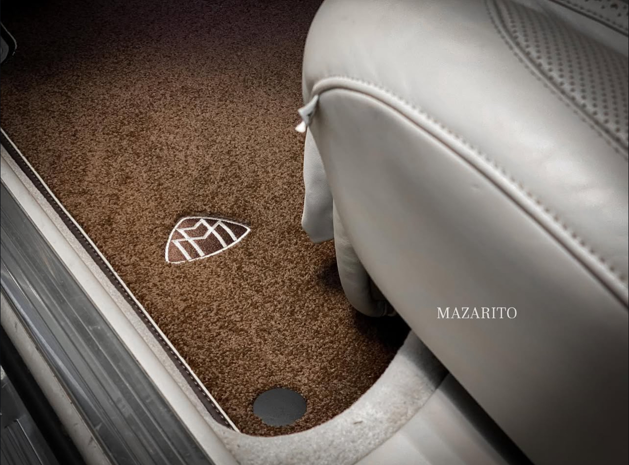 Плотный ворс с крученой нитью на прорезиненной основе. Светлые вышивки AMG в салоне и большая вышивка лейбла AMG в багажном отсеке.