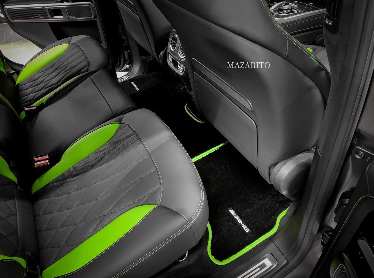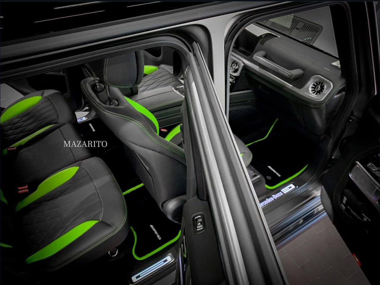 Новый G-Class с редким цветом салона - черный с зелеными вставками.