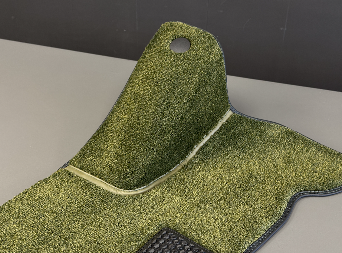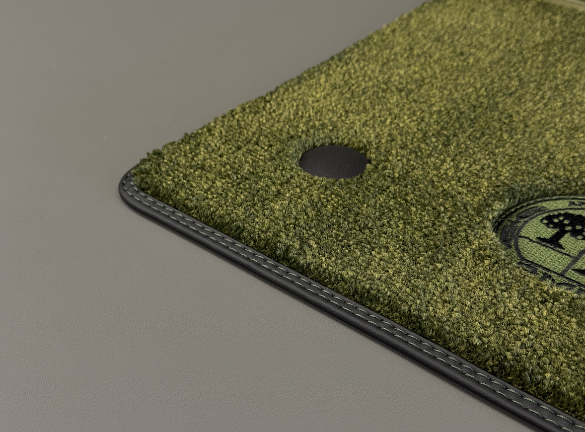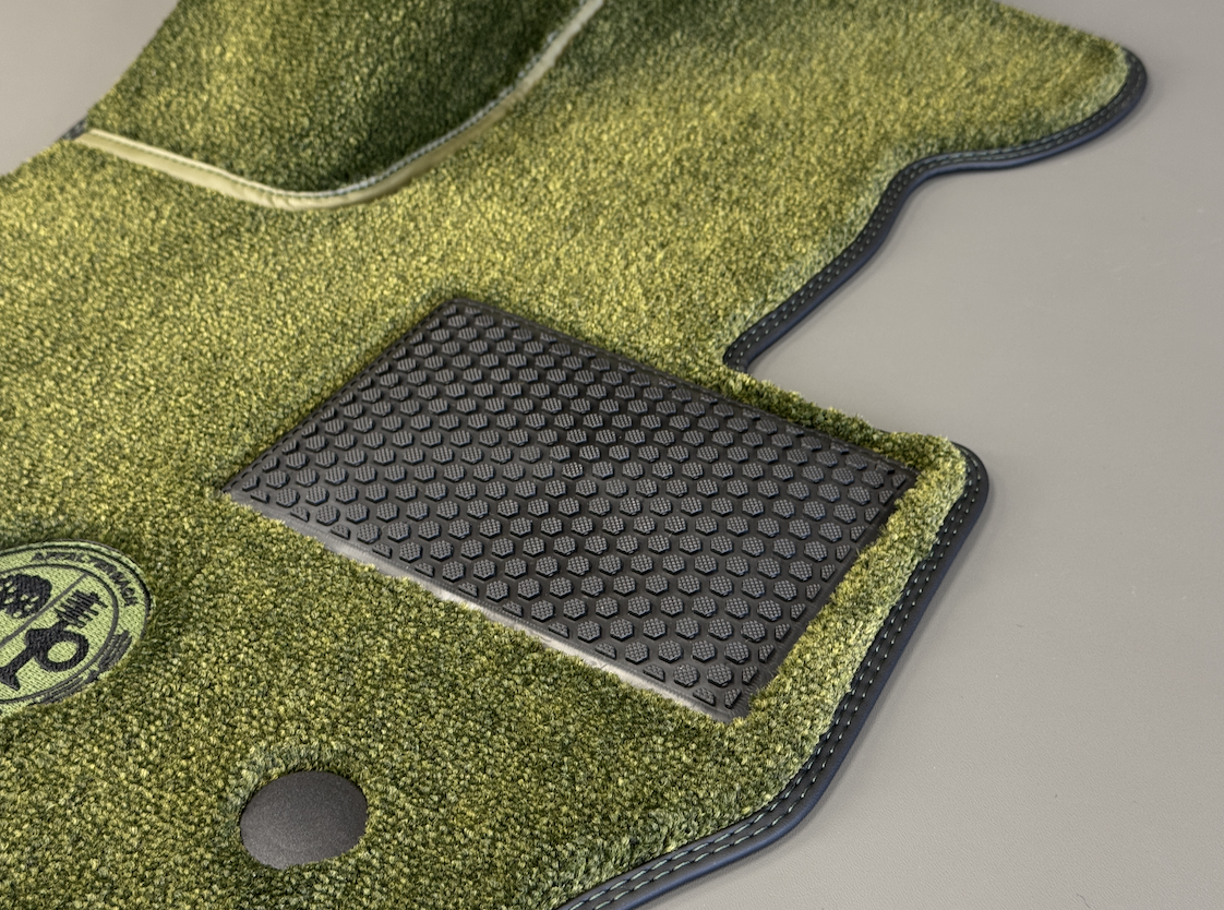 Очень красиво выглядит контрастная строчка на окантовке, в данном случае она темно-зеленого цвета и сочетается с цветом кузова авто.
