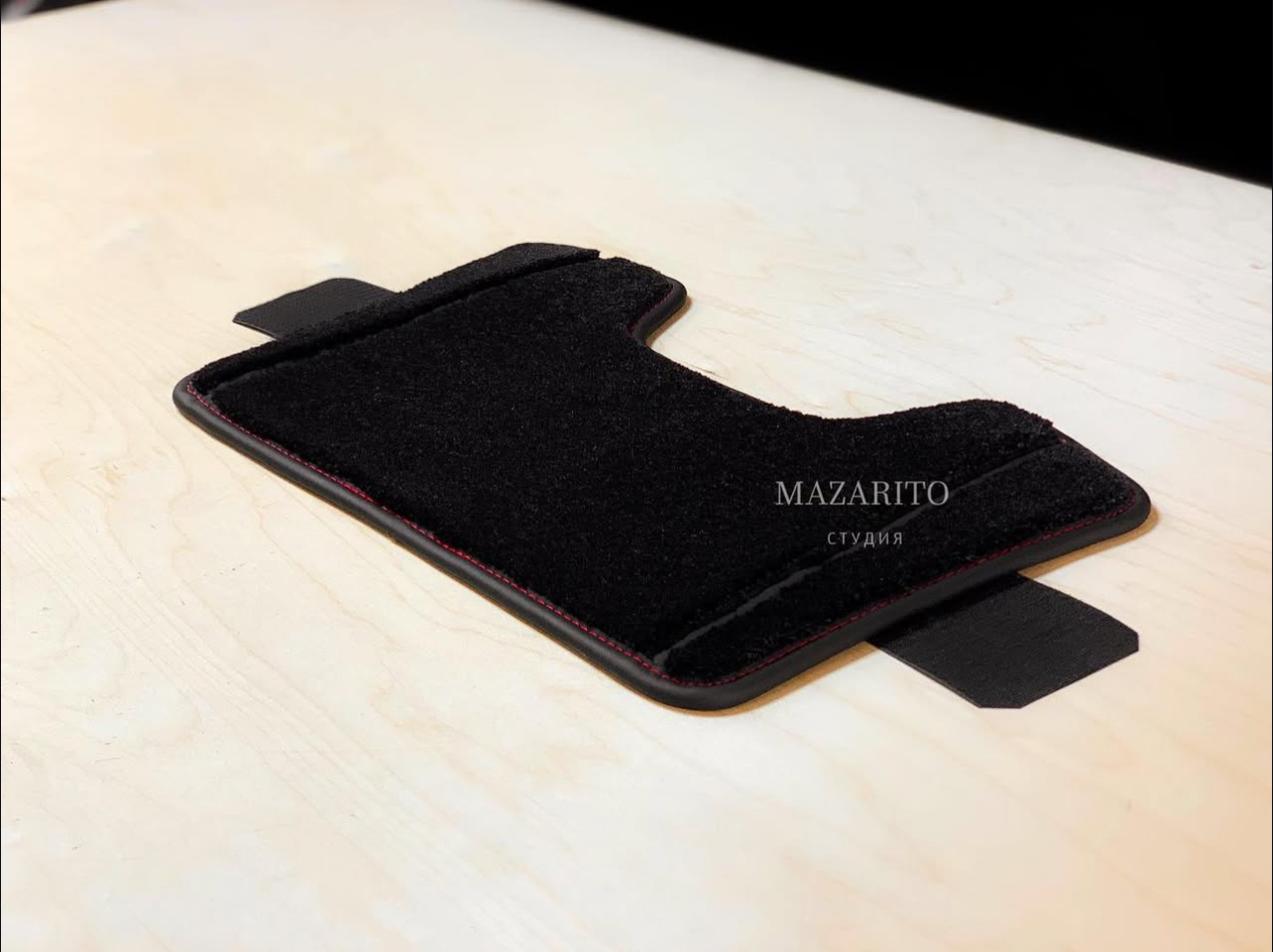 В данном случае был разработан и создан комплект с окантовкой из экокожи Наппа с двойной подгибкой. Так, окантовка обретает дополнительный внутренний кант контрастного цвета с эффектом 3D.