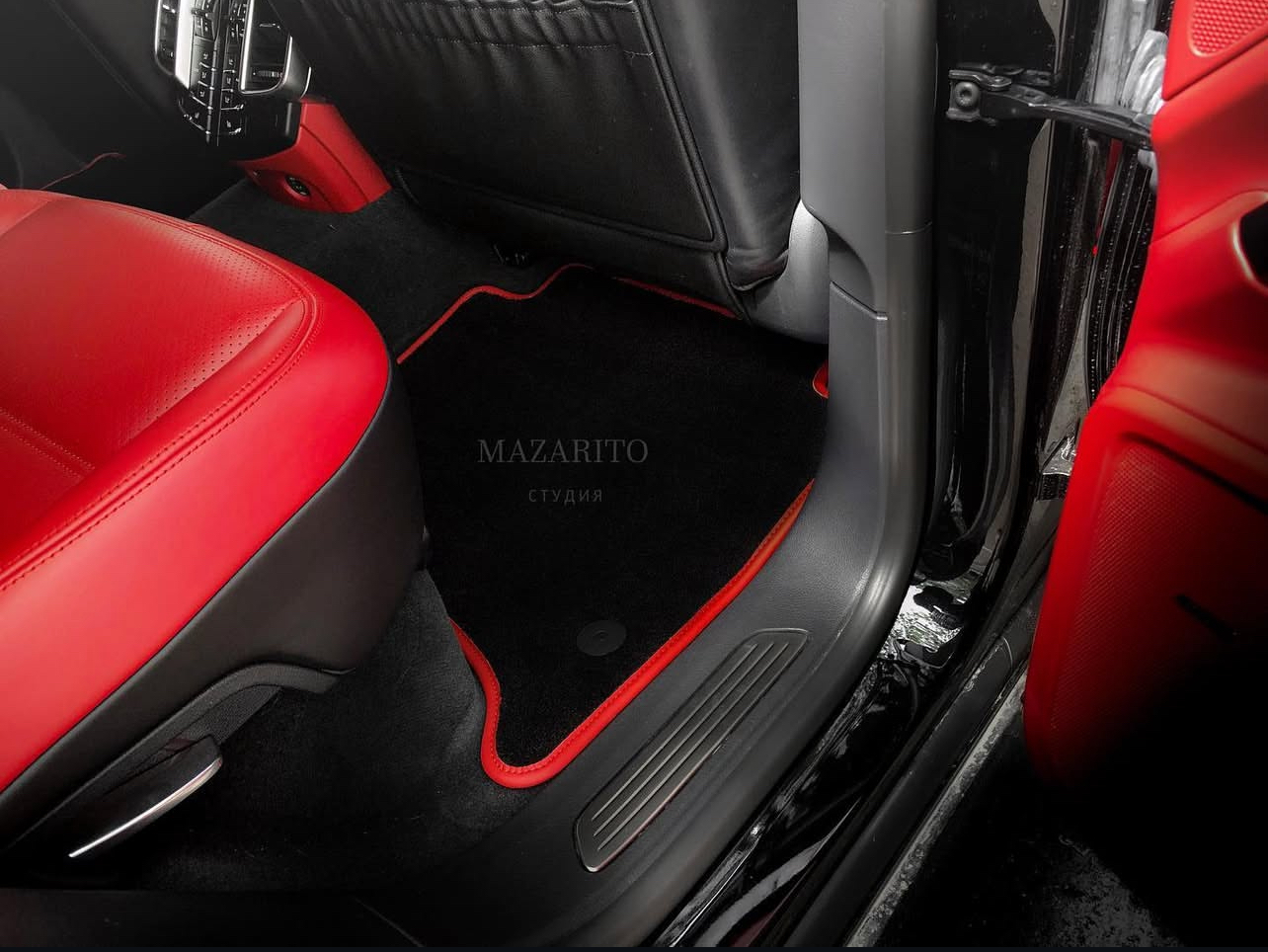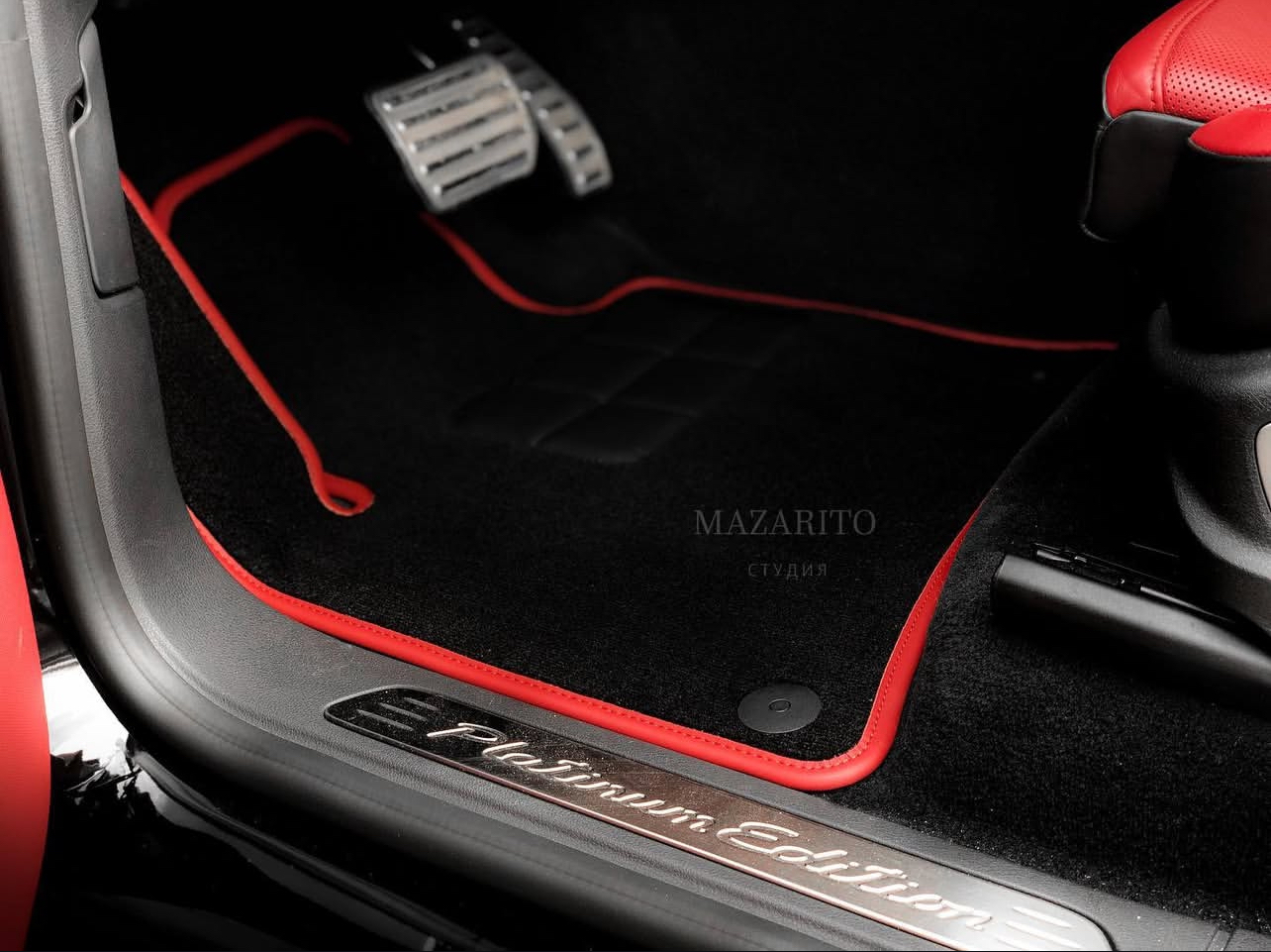 Мы предложили нестандартное решение: ворсовые ковры из материала Platinum 10 мм в сочетании с выразительными бортами из экокожи Nappa.
