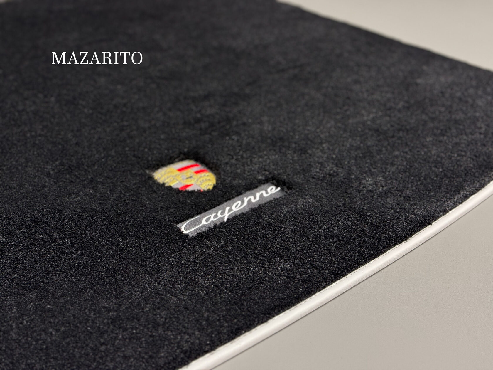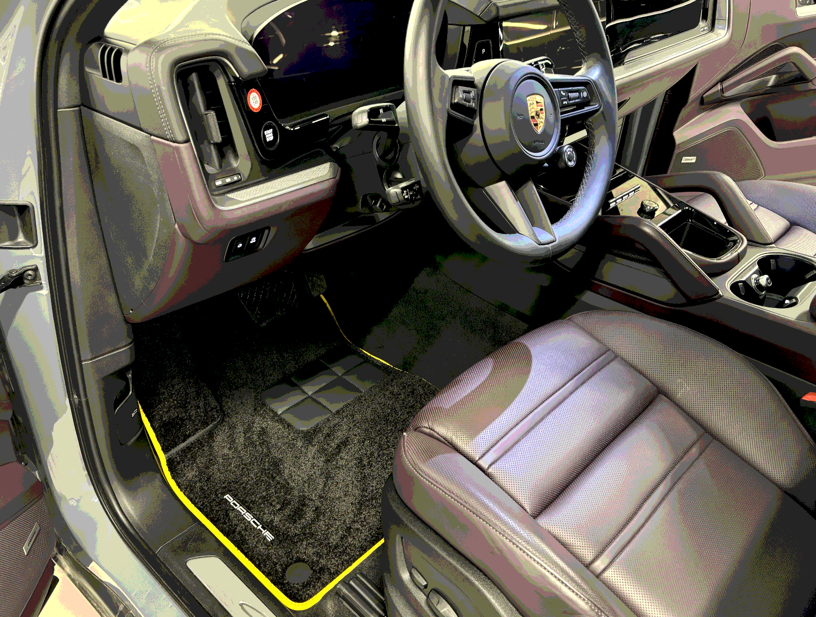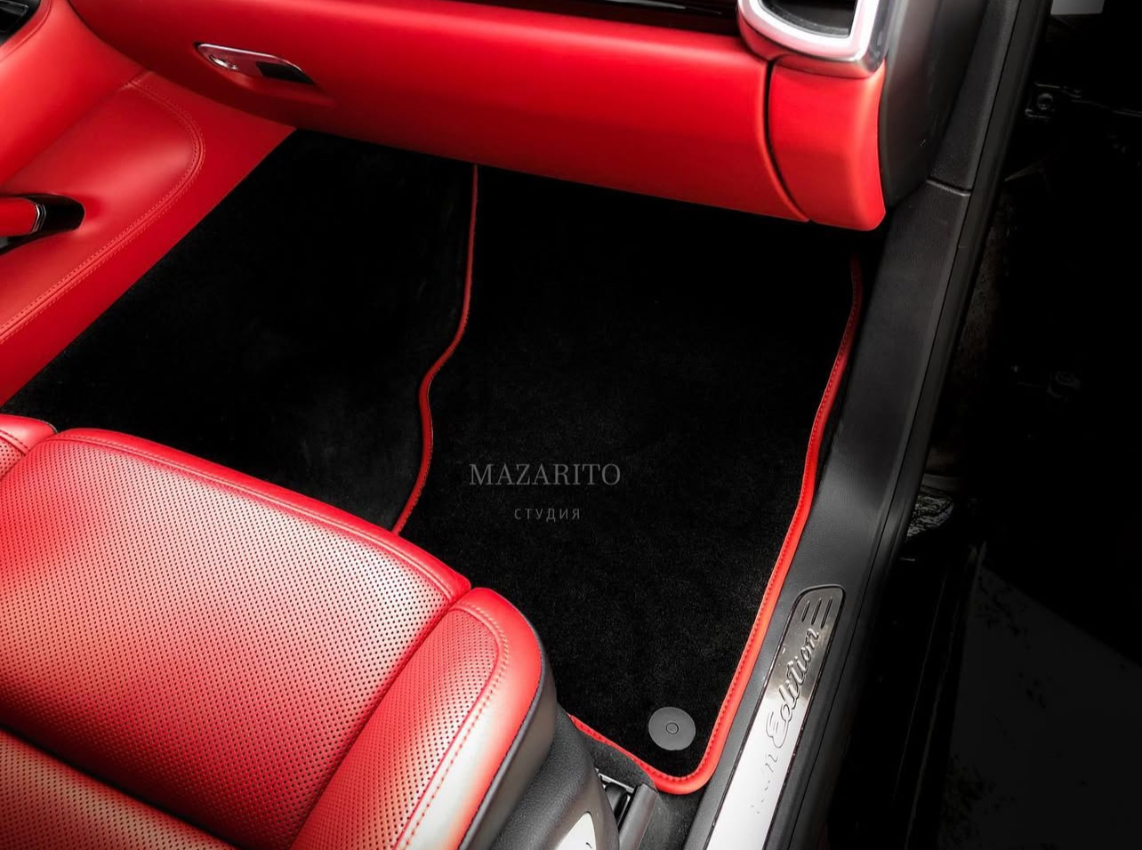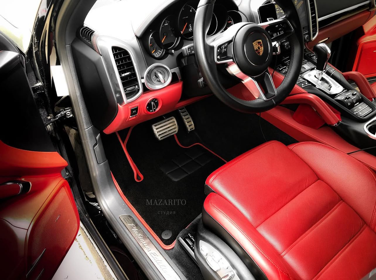 Эффектный получился комплект на Кайен. Сочетание практичного черного ворса и светлых элементов очень красиво дополнят салон.