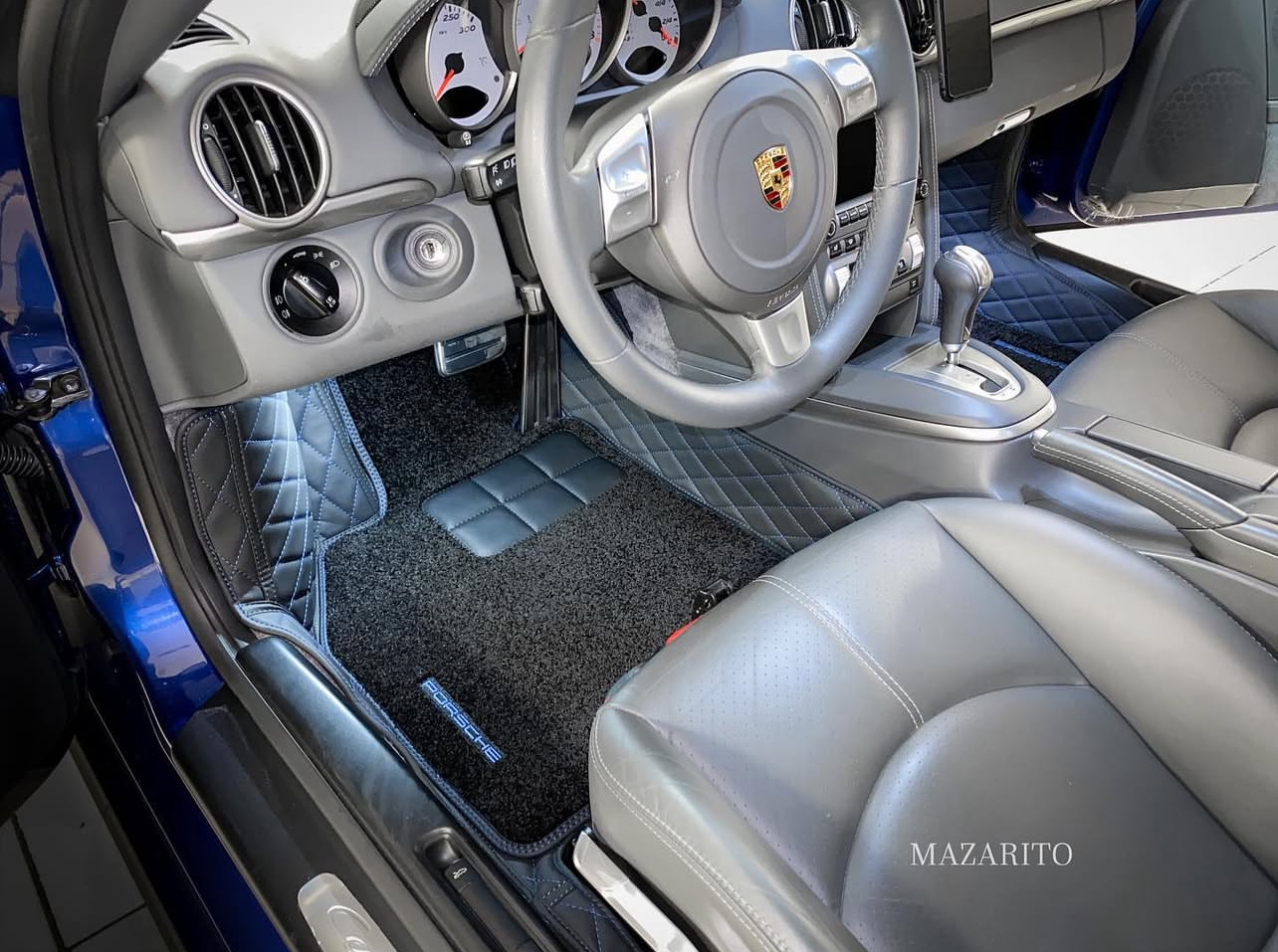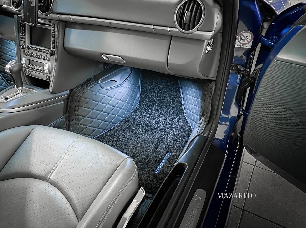 Цвет и высота ворса были выбраны под интерьер автомобиля, а аккуратная двойная синяя строчка завершила образ. Получилось стильно, функционально и с характером — как сам Cayman.